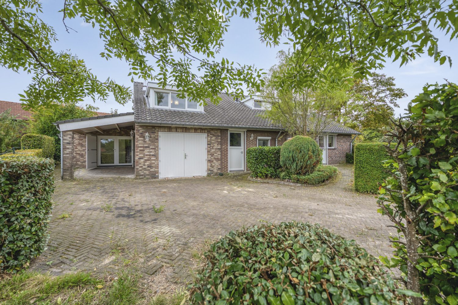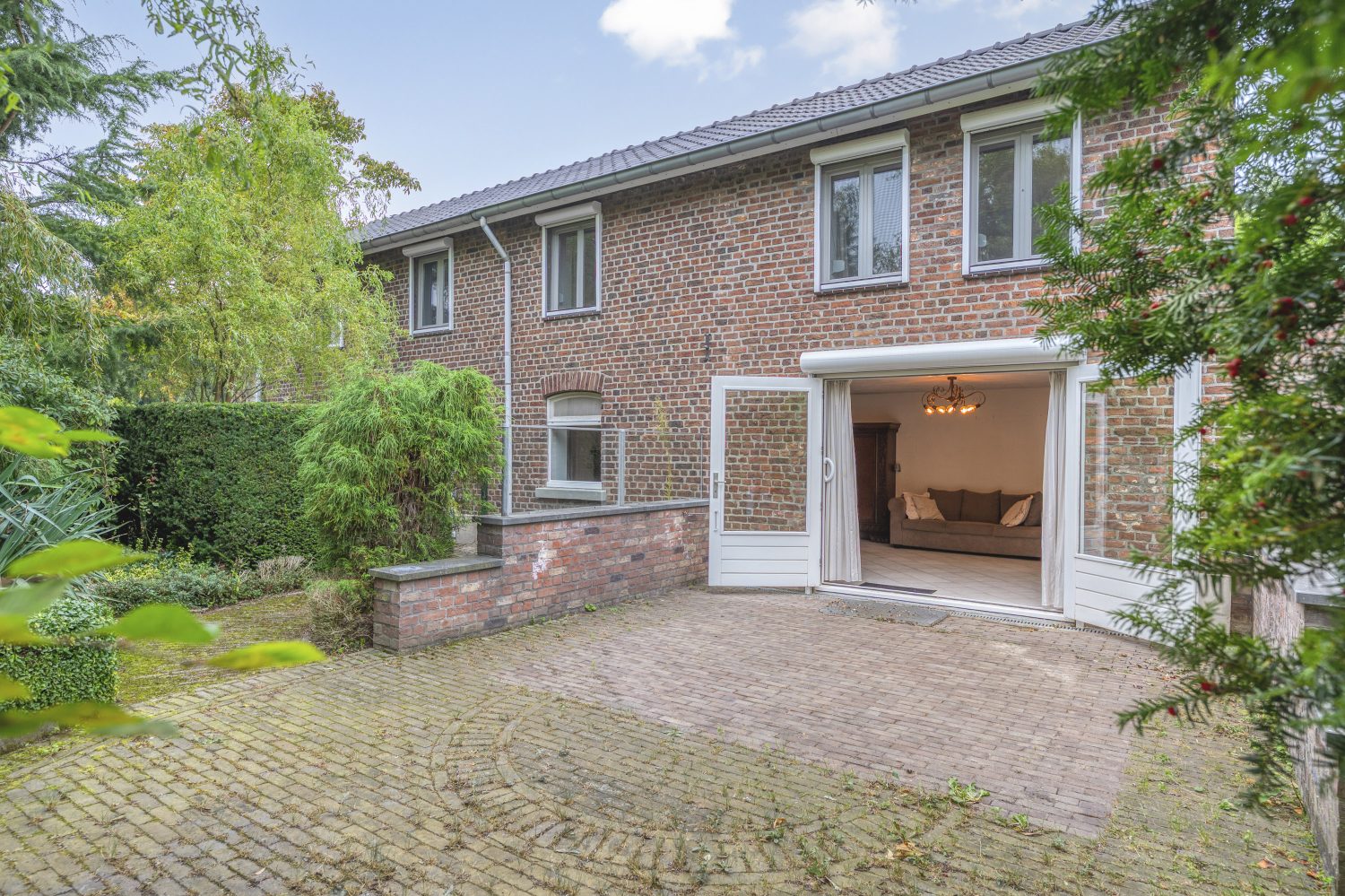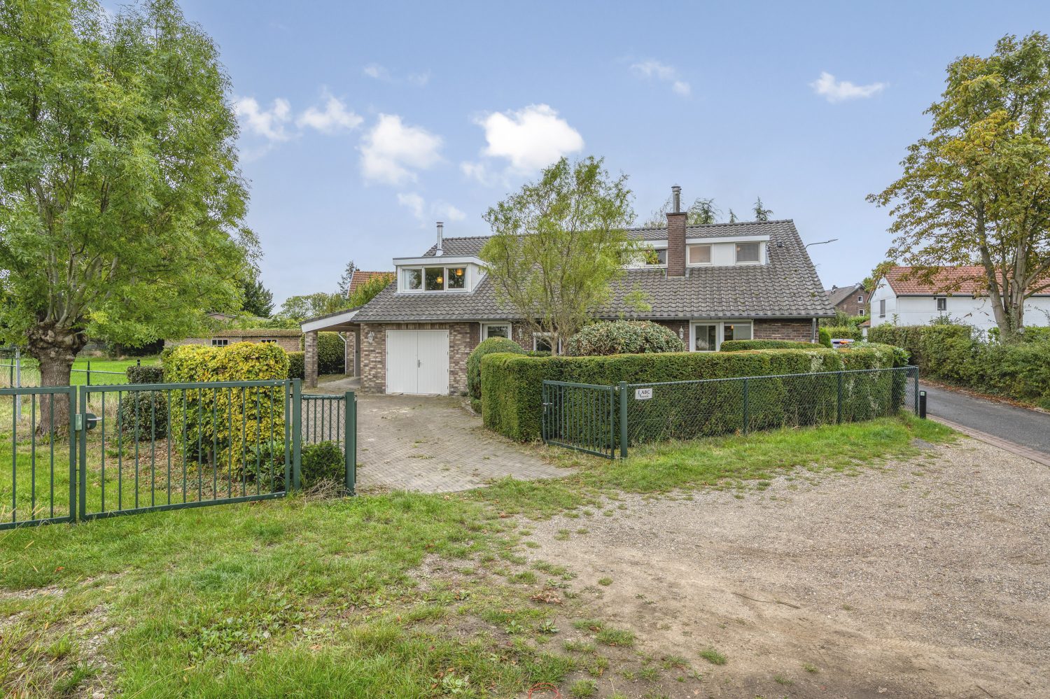Dit fraaie huis wordt omringd door een tuin met veel groen, variërend van bomen tot hagen en struiken. De tuin aan de kant van de woonkamer is gesitueerd op het zuiden en aan de andere zijde is een tweede oprit, met ruimte voor meerdere auto’s.