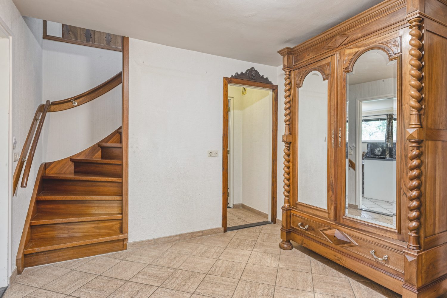 De officiële entree is aan de rechterzijde van het fraaie woonhuis, bij de eerste oprit. De ontvangsthal heeft, net als de rest van de begane grond, een ruime opzet. Hier zijn de meterkast en de hardhouten trap naar de eerste verdieping.