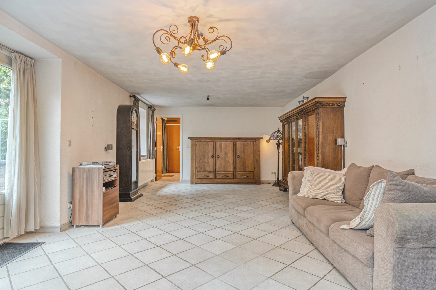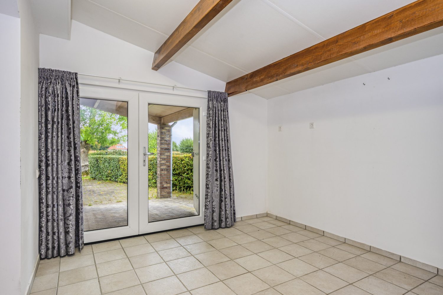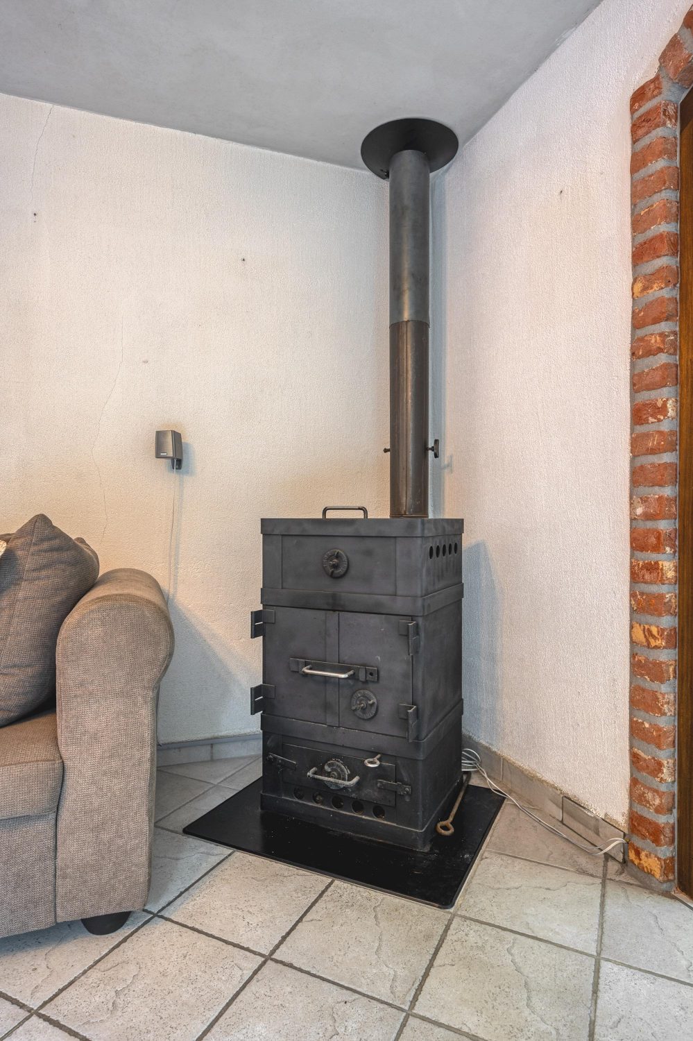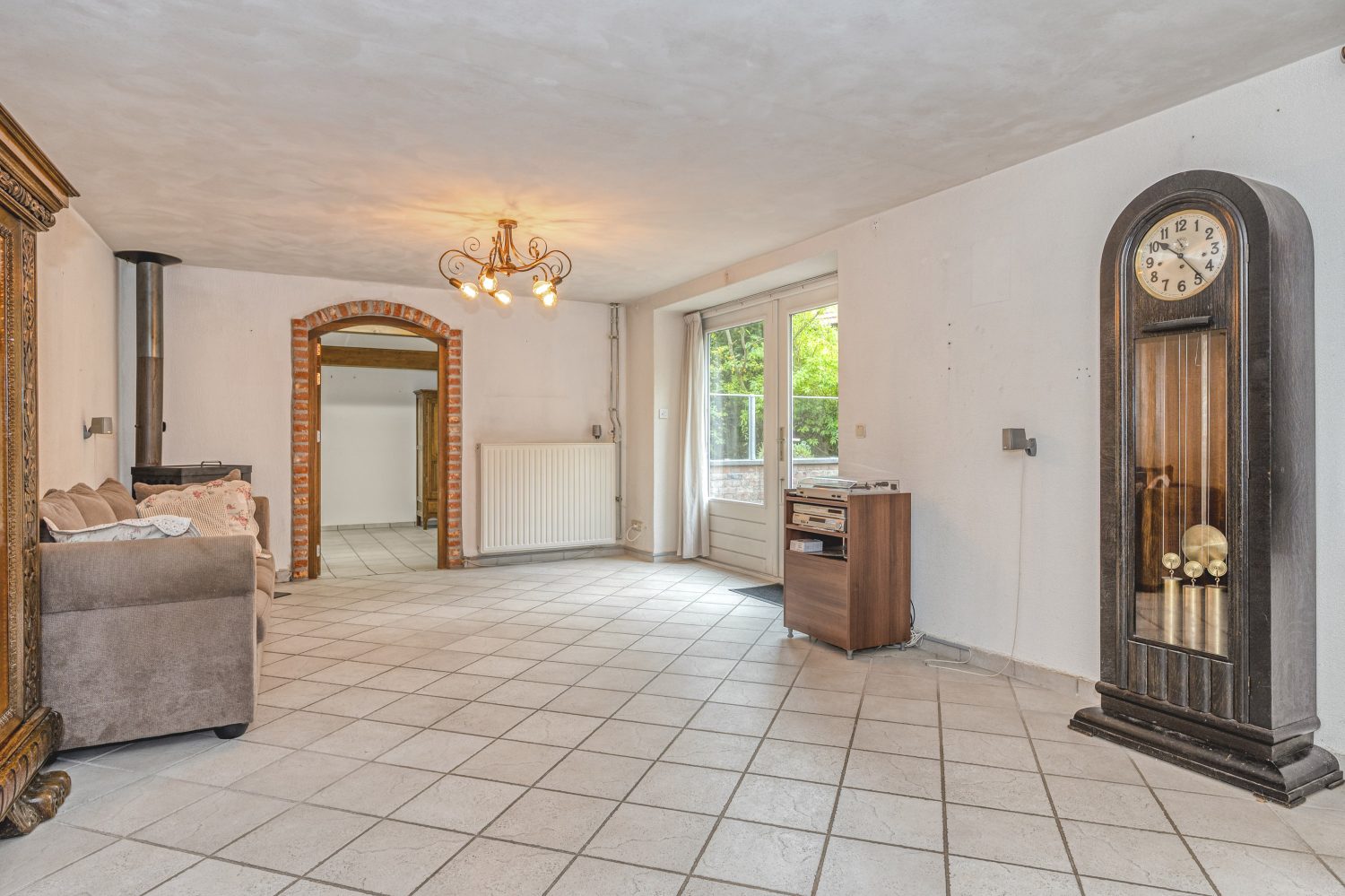 Aan de voorzijde is de woonkamer, die geheel als zitkamer ingedeeld kan worden. In een hoek van de woonkamer staat een Thor Dania houtkachel, die de ruimte snel op een aangename temperatuur brengt. Openslaande deuren geven toegang tot de tuin met terras aan de zonnige zuidkant. Voordeel van deze ligging is dat er in de woonkamer veel licht naar binnen valt.