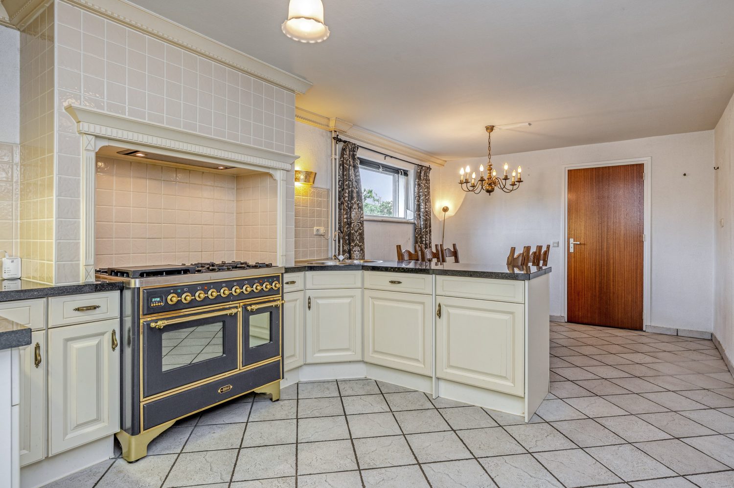 De eetkeuken is een gezellige plek in huis, waar de zon ’s middags en ’s avonds naar binnen valt. Er is genoeg plek voor een eettafel en de royale hoekopstelling is uitgevoerd in een landelijke stijl. Blikvanger is het Boretti Majestic 5 pits-gasfornuis met twee ovens en verder zijn er een koelkast, afzuiging en een vaatwasser ingebouwd.