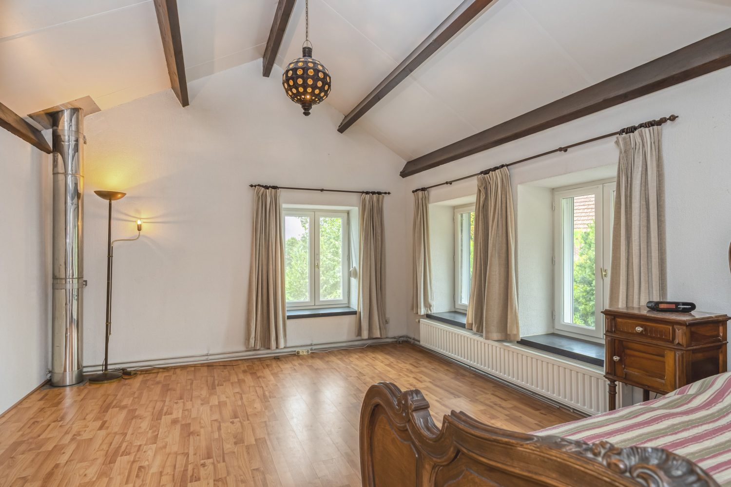 Volg de hardhouten trap in de hal, richting de eerste verdieping. Hier wordt u, net als beneden, verrast door de ruimte en indeling. Vanaf de overloop zijn drie slaapkamers te bereiken, gesitueerd aan de voorzijde. Fraaie elementen zijn het hoge, schuine dak en de houten balken. Een van deze slaapkamers heeft een eigen badkamer met een douche, wastafelmeubel en een toilet. De derde badkamer in huis, met een bad en wastafel, is vanaf de overloop te bereiken.