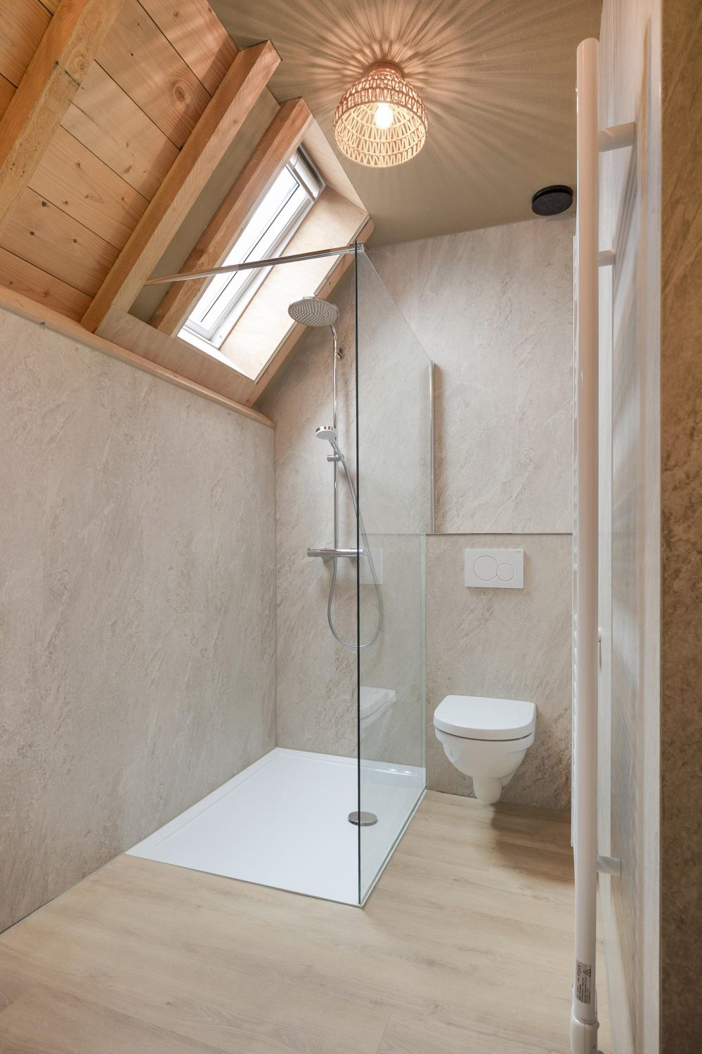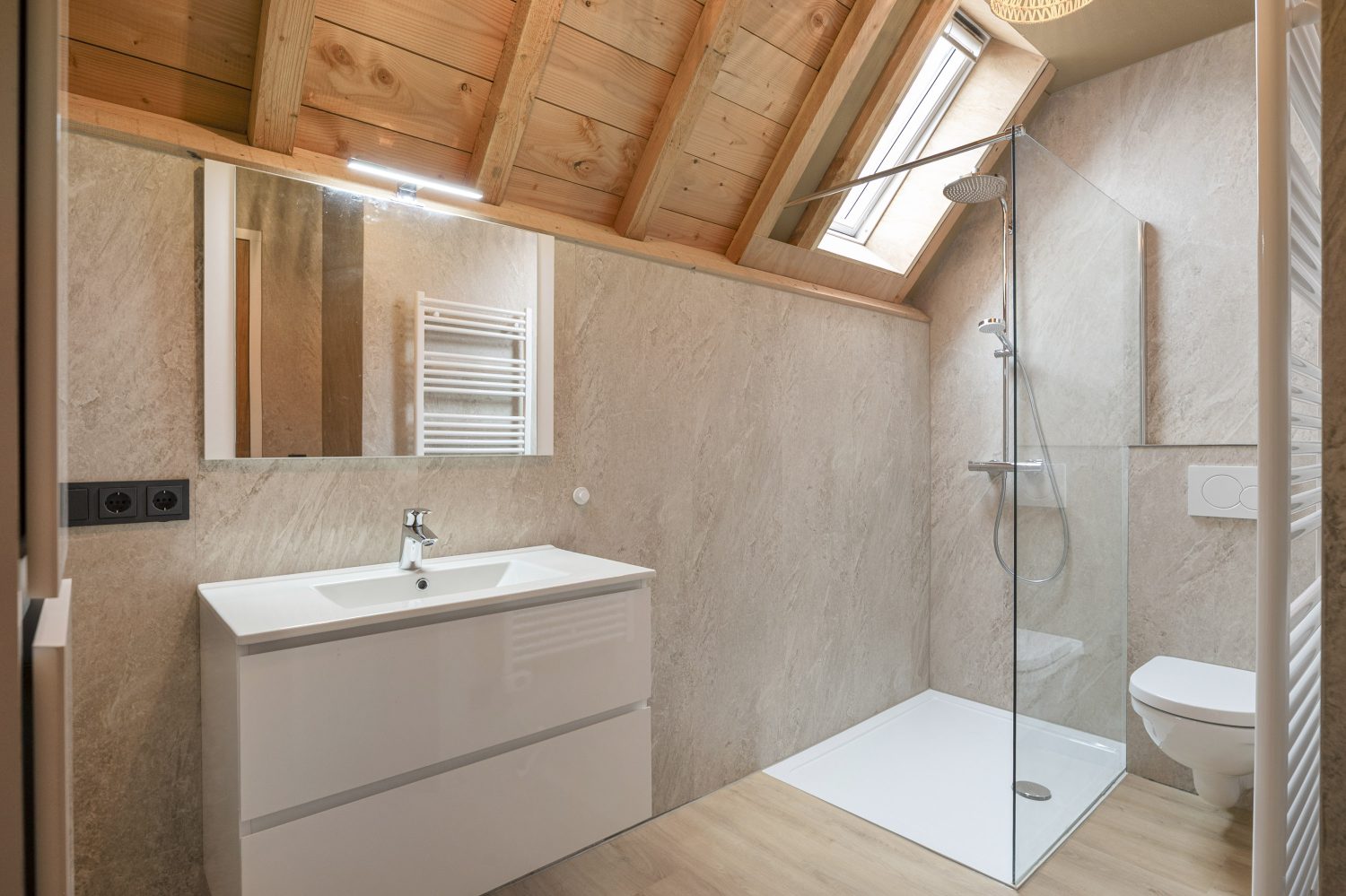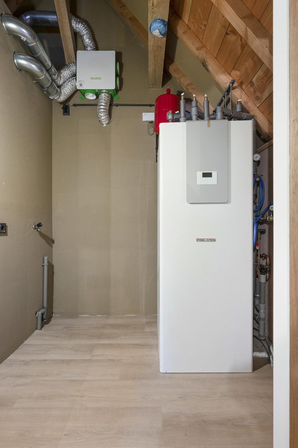 De badkamer op deze verdieping heeft dezelfde voorzieningen als de badkamer beneden, maar dan met een andere indeling. Naast de badkamer is een inpandige berging met de warmtepomp en de aansluiting voor de wasmachine.
