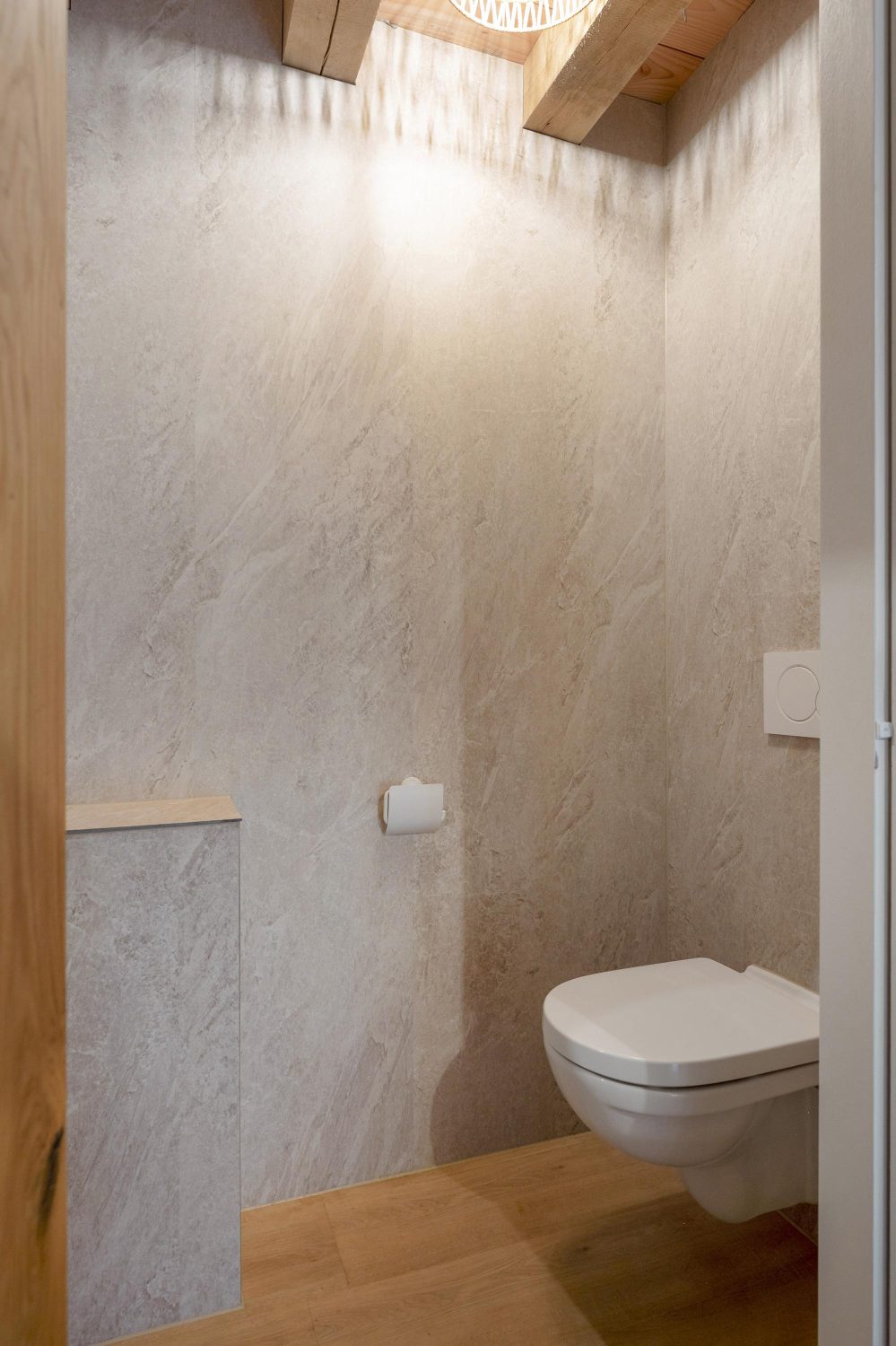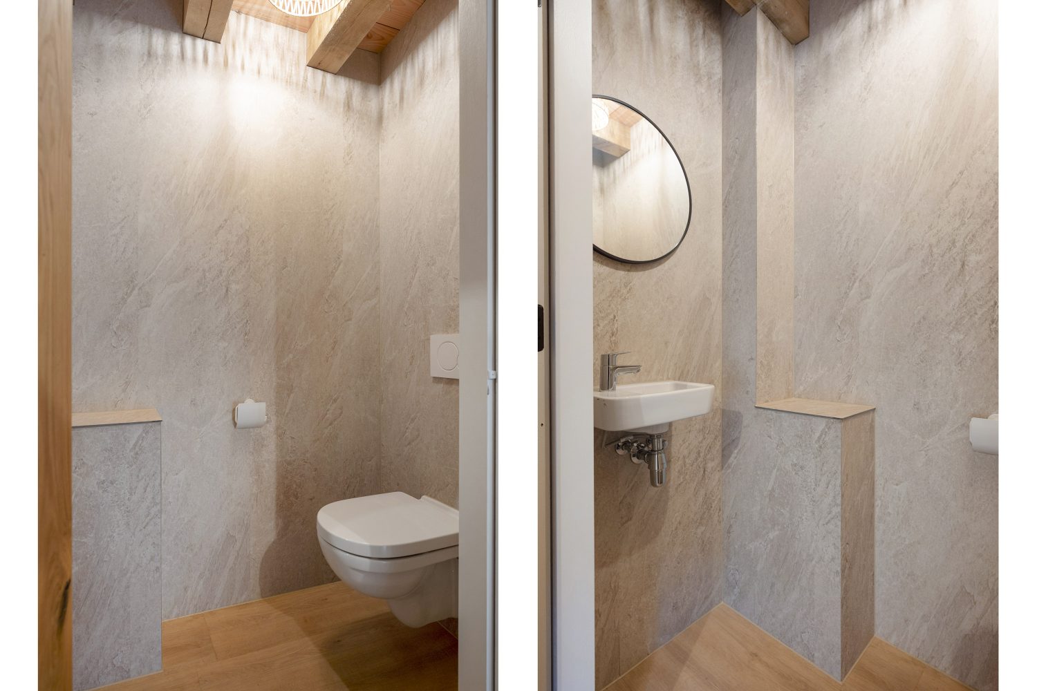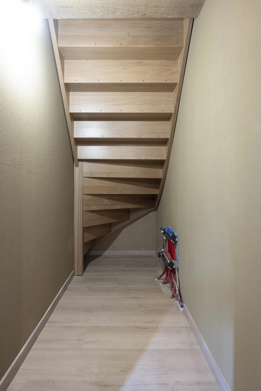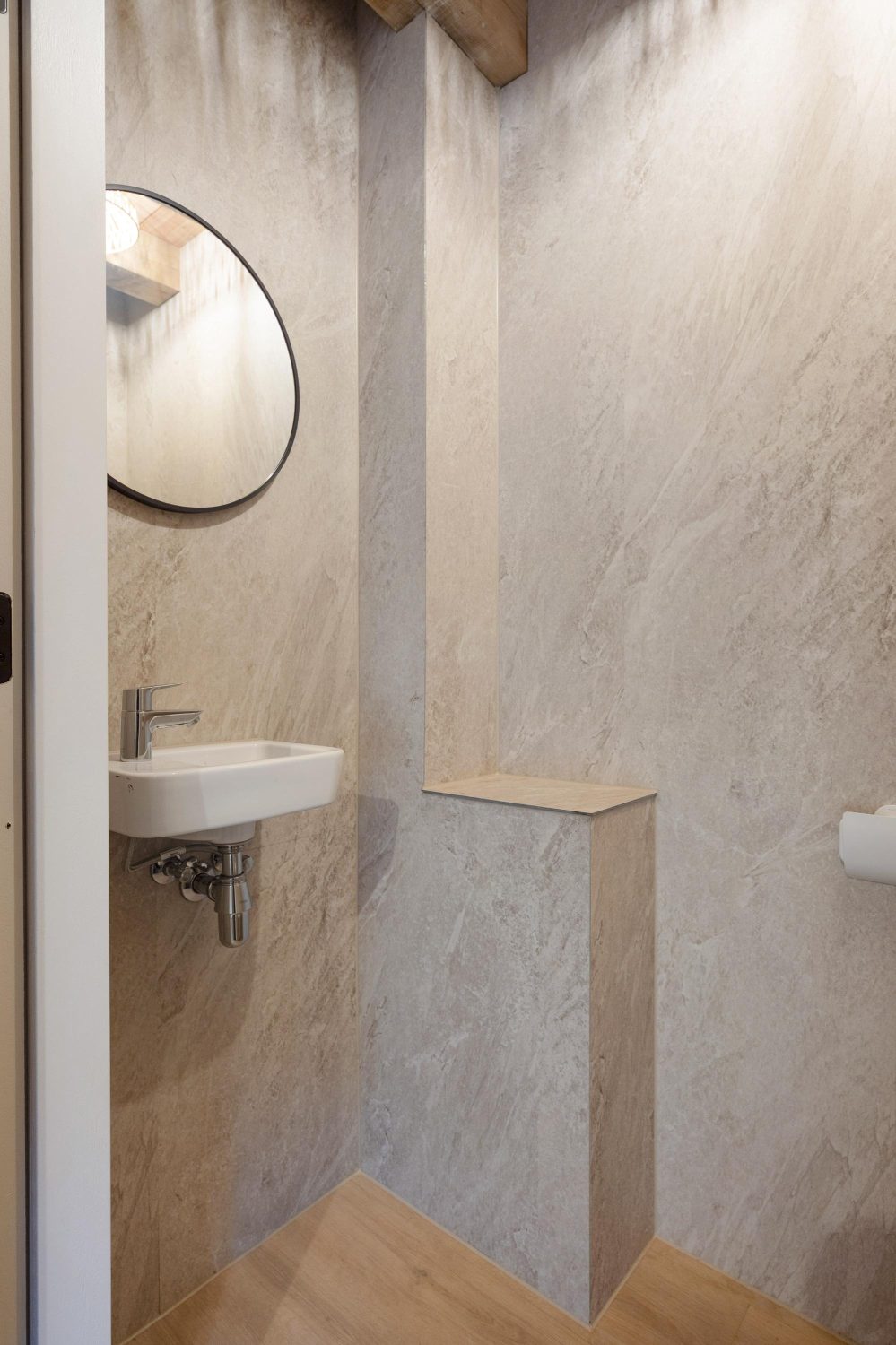 De badkamer op deze verdieping heeft dezelfde voorzieningen als de badkamer beneden, maar dan met een andere indeling. Naast de badkamer is een inpandige berging met de warmtepomp en de aansluiting voor de wasmachine.