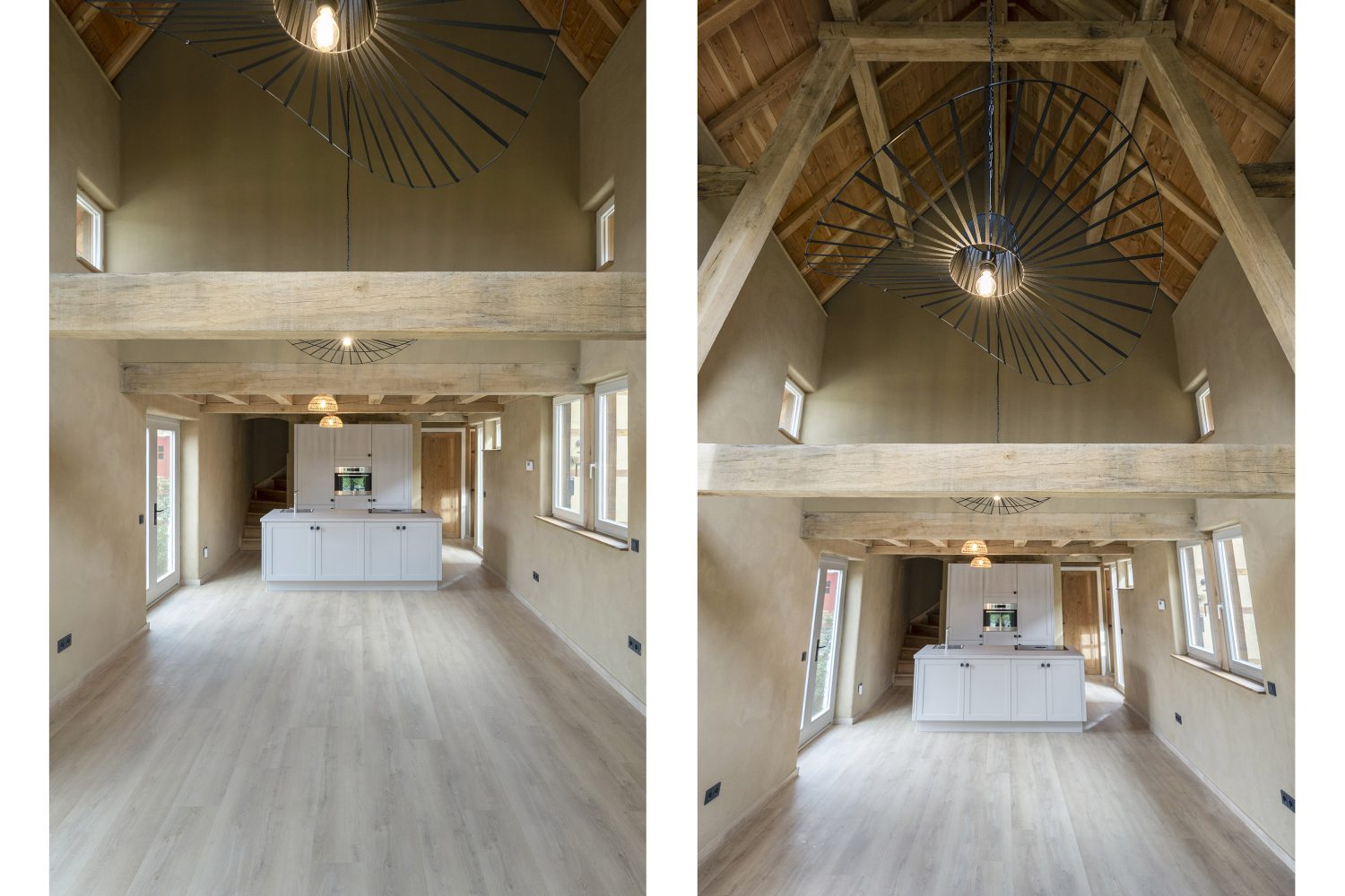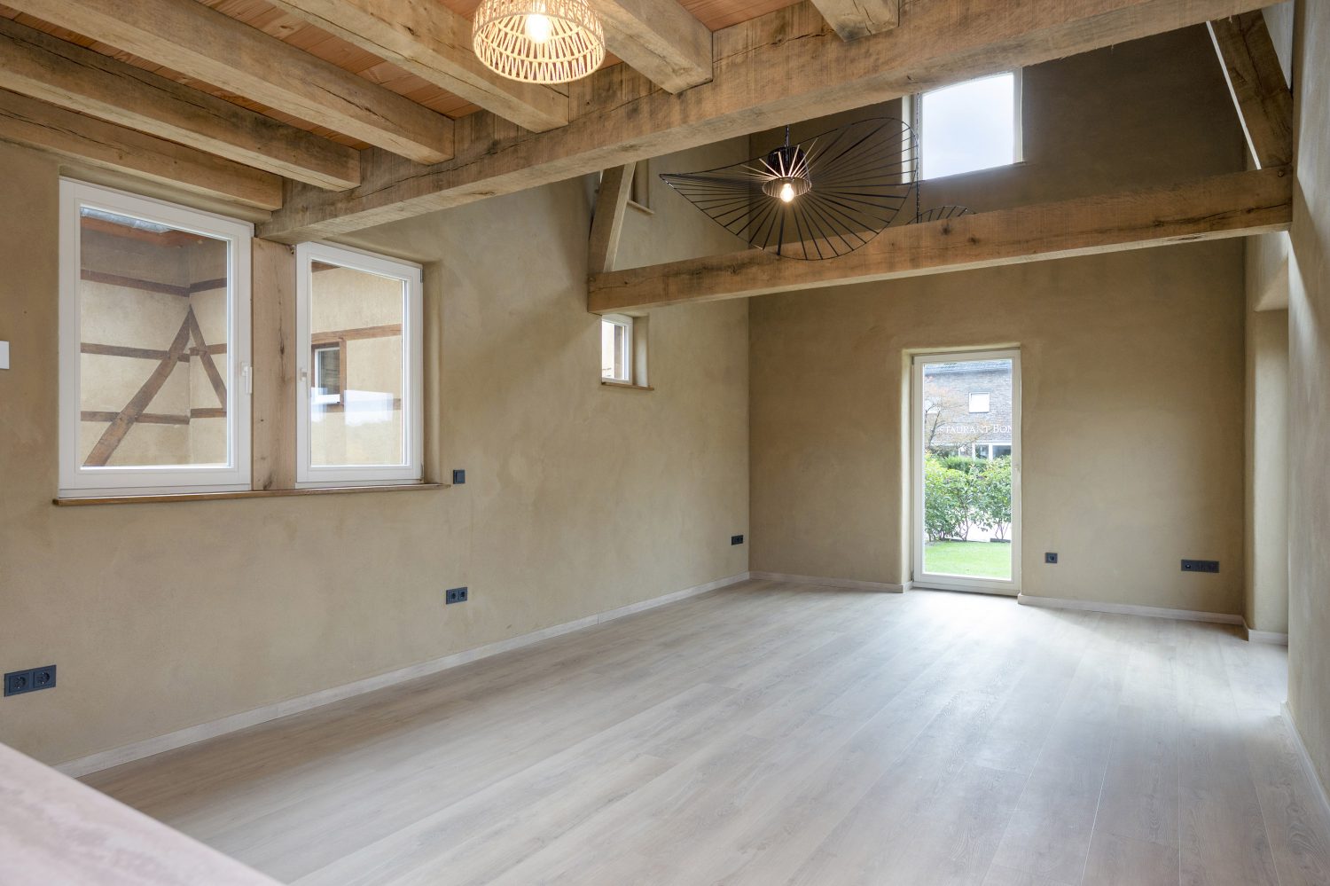 Met een oppervlakte van circa 40 m² biedt de woon-/eetkamer met keuken een leefruimte van een prettig formaat. Bewonder de houten balken, de hoge vide en het leemstuc die voor een leefruimte met sfeer zorgen. Er zijn meerdere openslaande deuren naar de tuin en aan drie kanten valt het daglicht naar binnen.
