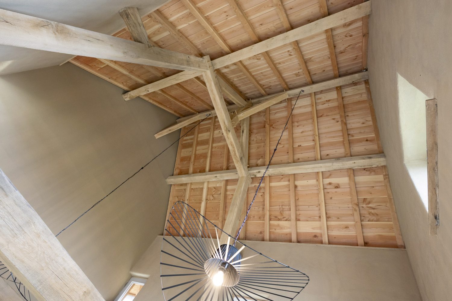Het oorspronkelijke bouwjaar is 1828 en in de afgelopen jaren is de hoeve volledig opnieuw opgetrokken met behoud van enkele originele balken, spanten en de vakwerkconstructie. De wanden zijn grotendeels afgewerkt met leemstuc, de geïsoleerde begane grondvloer is voorzien van vloerverwarming en de hardhouten kozijnen zijn uitgevoerd met triple glas. Een warmtepomp zorgt voor een aangename temperatuur en uiteraard zijn de gevels, net als het dak, voorzien van isolatie. Op het dak liggen 8 zonnepanelen, wat als geheel zorgt voor een lage energierekening.