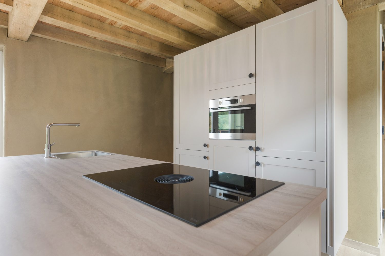 De keukenopstelling met een groot eiland is uitgevoerd in een fraaie stijl, die goed past bij de woning. Aan bergruimte is geen gebrek en de Bora inductie kookplaat met afzuiging, de vaatwasser, combi-oven, koelkast en vriezer zijn ingebouwd.